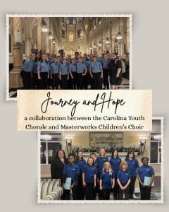 The concert is a collaboration between the Carolina Youth Chorale of Myrtle Beach, SC directed by Sara Morey and the Masterworks Children’s Choir of Florence, SC directed by Jaime Martinez. Both choirs will sing separately and together songs that outline the theme of Journey and Hope, featuring Mark Burrows’s Canon of Hope and Jacob Narverud’s Sisi Ni Moja.