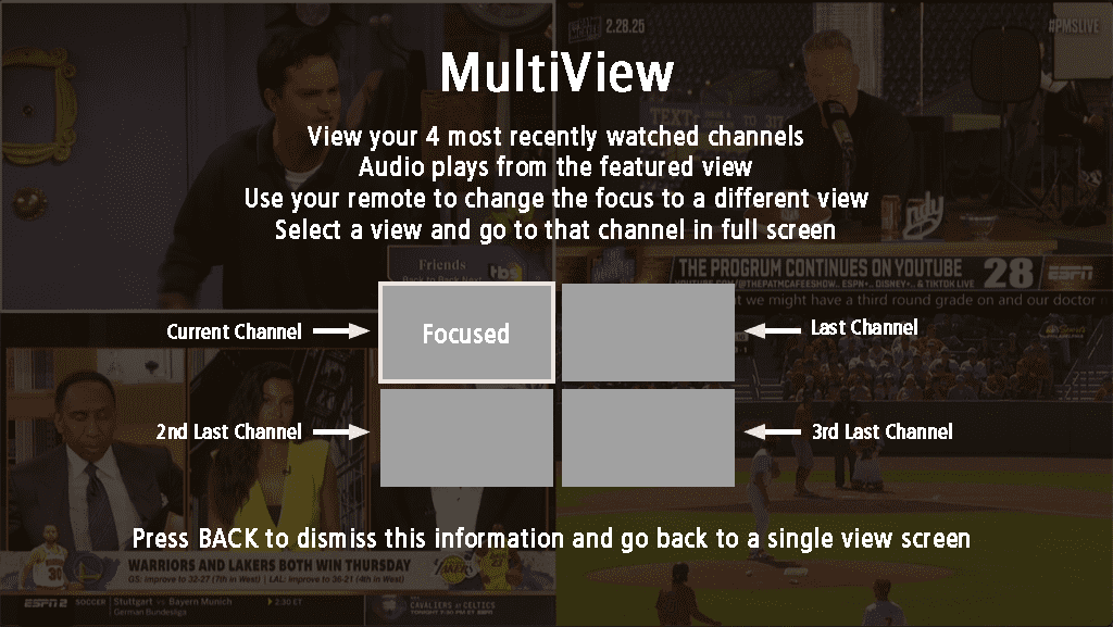 MultiView will display the four (4) most recently watched live television channels on one screen for the user’s profile.