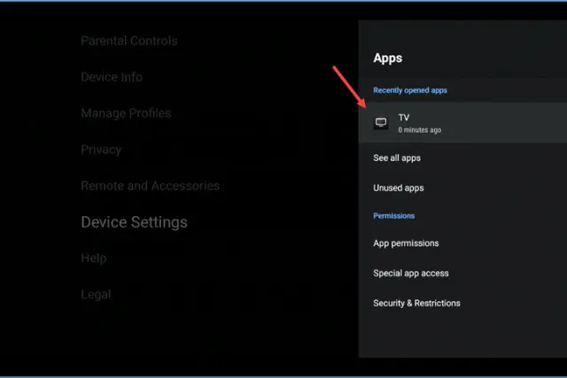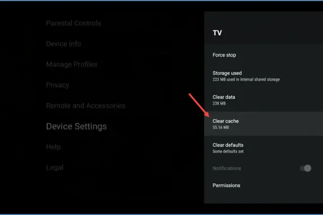 Step 6: Inside the TV app menu, select Clear Cache, then confirm by selecting OK.