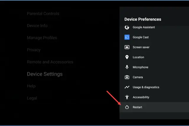 Step 8: In Device Preferences, scroll all the way down to Restart, and follow the prompts to restart your Force 1 device. The device will power off and then automatically return to your show once it restarts.